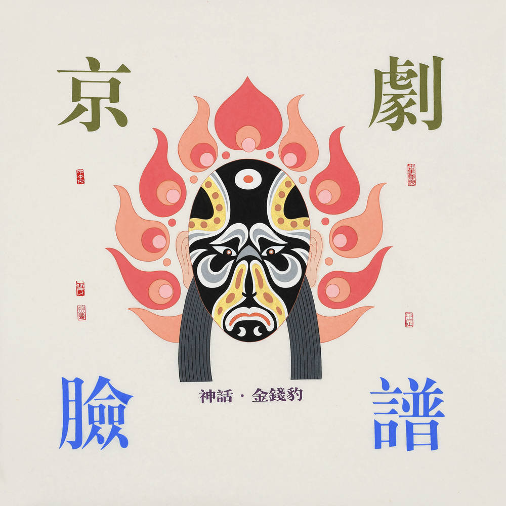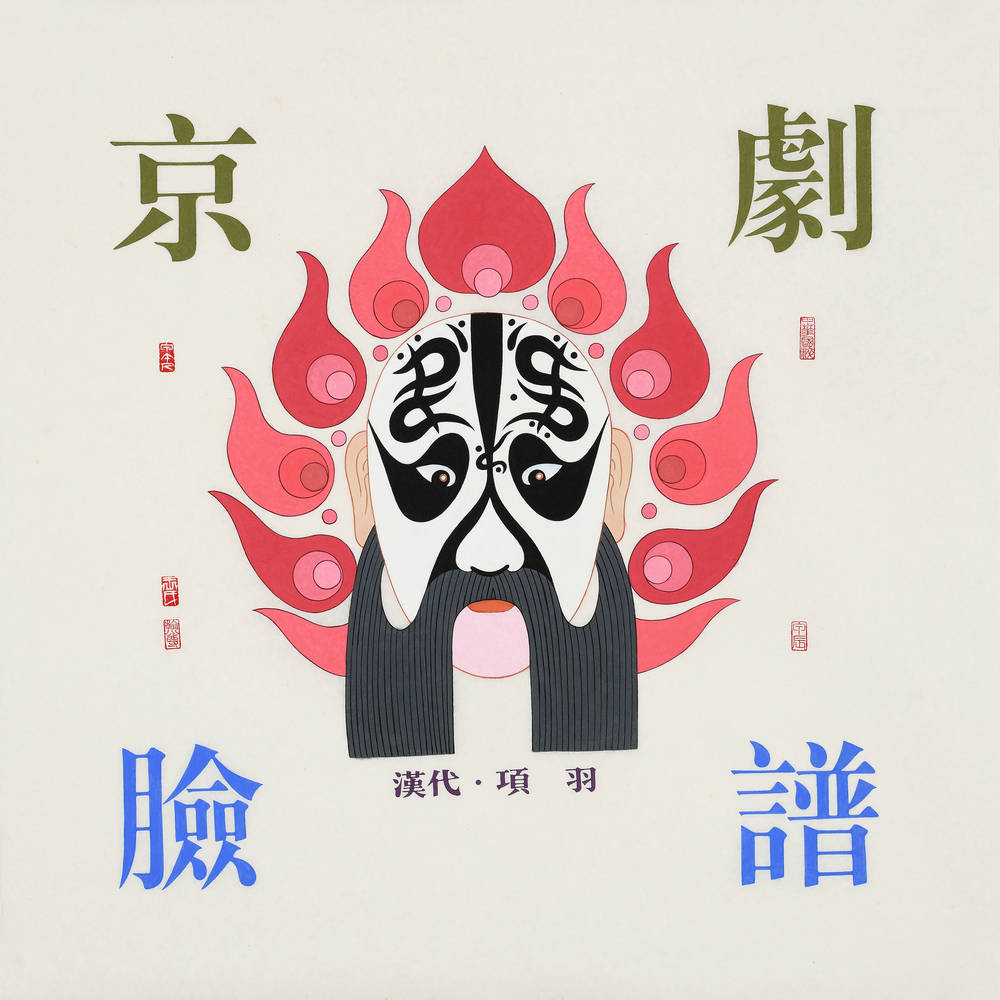十幅京剧脸谱分别为:孙悟空(神话)、钟馗(神话)、金钱豹(神话)、典韦(三国)、窦尔敦((清代)、包拯(宋代)、关羽(三国)、鲁智深(宋代)、项羽(汉代)、周处(晋代)等不同时期的代表人物(均为70x70cm·4平方尺幅)。作者在这些传统脸谱构图上独出心裁地添绘了带有不同吉祥色彩的光环图案,使这套看似普通的国粹造型艺术脸谱又增添了一种特殊的艺术韵味!