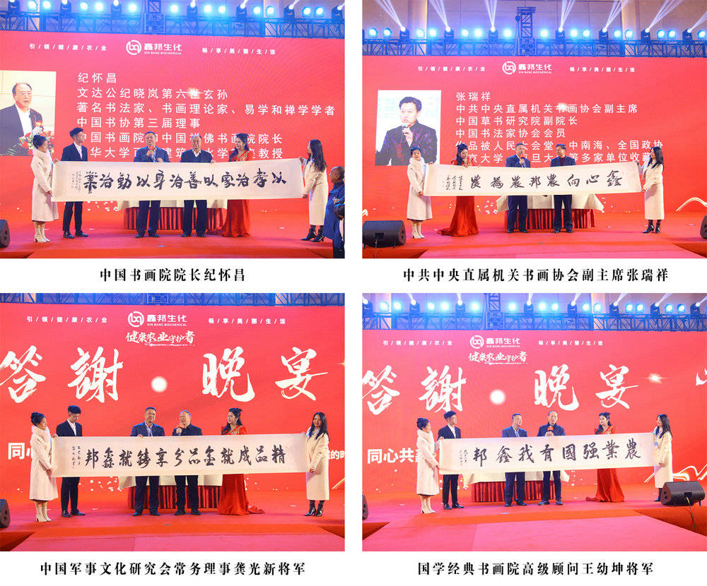 晚宴环节将论坛氛围推向高潮,由江西鑫邦生化有限公司出品,北京木易鼎尚文化传媒发展有限公司承制的文艺汇演可谓精彩纷呈。中国书画院院长纪怀昌现场书写作品《以孝治家,以善治身,以勤治业》,中共中央直属机关书画协会副主席张瑞祥现场书写作品《鑫心向农,邦农为农》、中国军事文化研究会常务理事龚光新将军现场书写作品《精品成就金品,分享铸就鑫邦》、国学经典书画院高级顾问王幼坤将军现场书写作品《农业强国,有我鑫邦》,为论坛注入深厚文化底蕴。