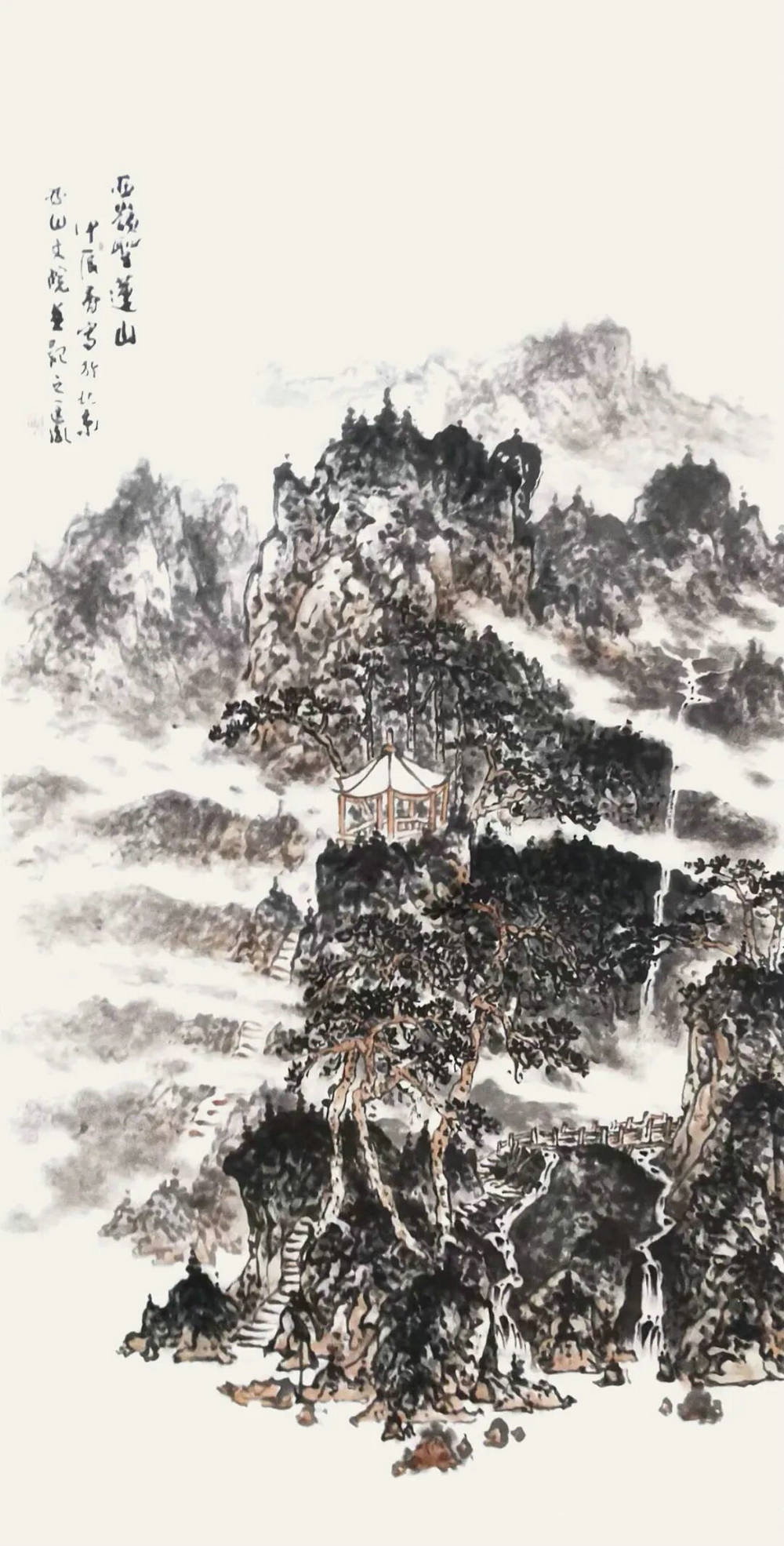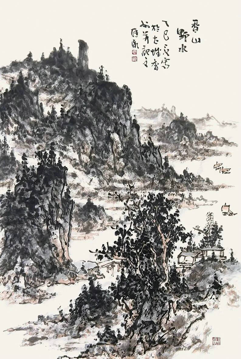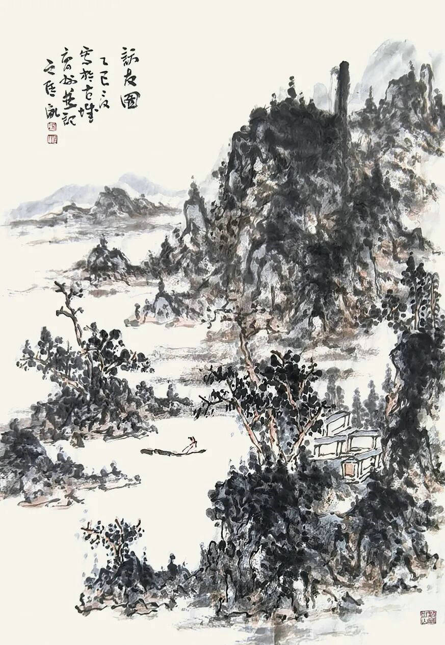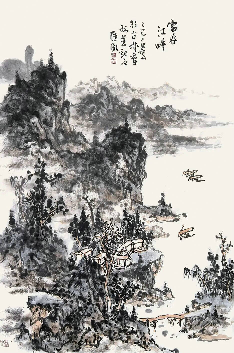 传统筑基,融古出新:深耕宋元诸家及清四僧、黄宾虹等笔墨精髓,师从范扬、李荣海、白崇然等名家,练就扎实的传统功底。他不泥古法,将大痴的苍润、石涛的灵变、龚贤的积墨法融会贯通,转化为适配当代审美与实景写生的笔墨语言。用笔兼具书法笔意,提按顿挫分明,刚劲中含蕴藉;用墨层次丰富,浓淡干湿焦互破互融,追求浑厚华滋的质感。