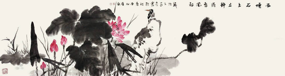 荷梗中锋劲挺,如写篆书,有“中通外直”的骨力;花瓣勾勒提按顿挫分明,柔中带刚;荷叶多用侧锋泼墨、兼皴带染,浓淡干湿层次足,破墨、积墨并用,不飘不浮。