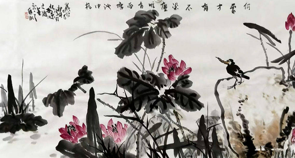 设色清雅沉稳,色不掩墨。多浅绛、淡彩,粉红、白荷配墨绿荷叶,极少甜俗重彩;偶用朱砂、花青点缀,也控制在墨骨之上,整体色调统一,有“出淤泥而不染”的文人清气;避免色压墨、艳俗刺眼的通病。