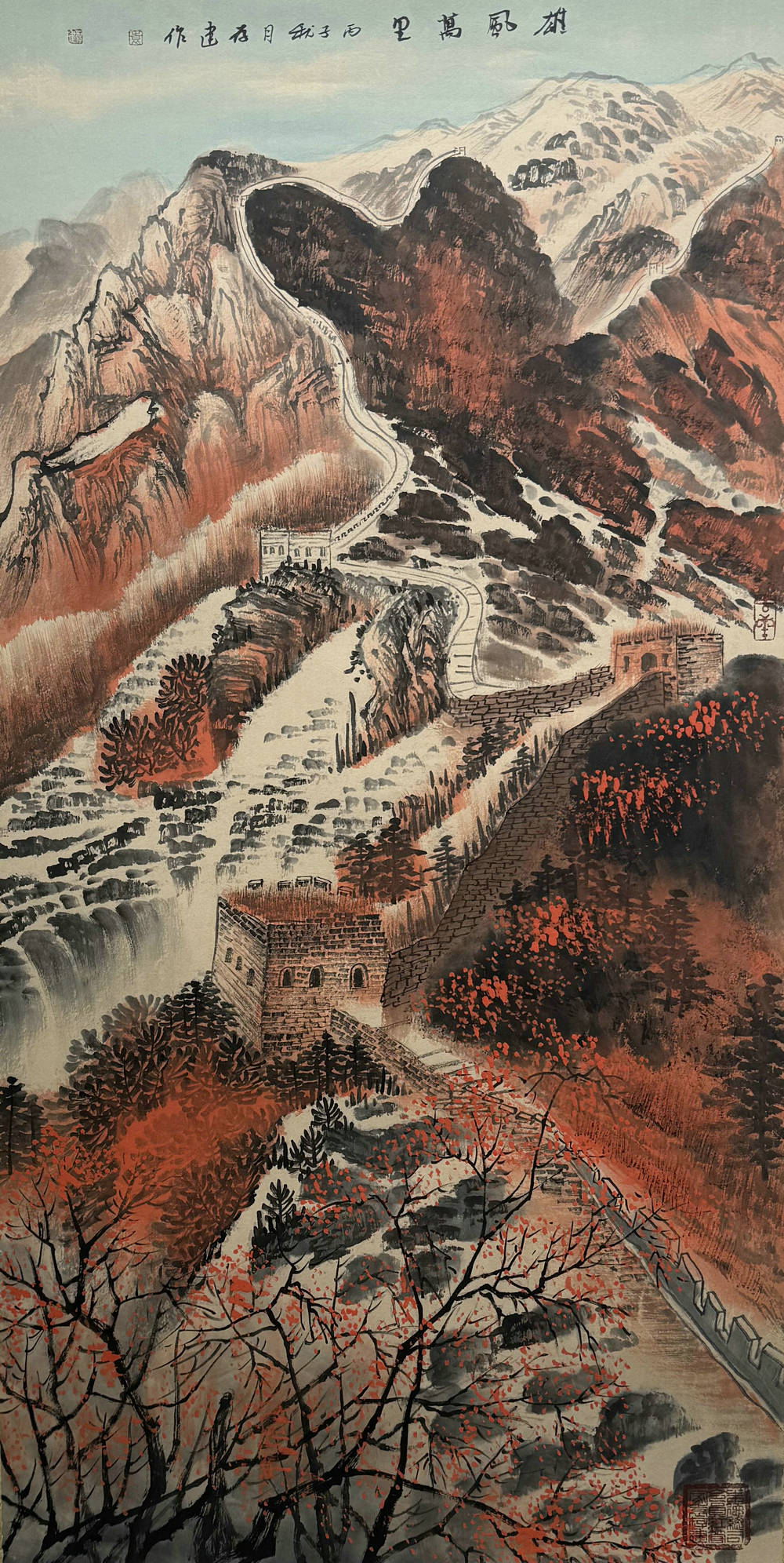 《雄风万里》以万里长城为主题,气势雄浑、意境壮阔,是典型的红色题材山水精品。长城是中华民族的精神象征,代表着坚韧、巍峨、不可侵犯。元帅亲历革命征途,从南昌起义到万里长征,从抗日战争到解放全国,心中始终装着祖国山河与人民安宁。这幅作品,既是对革命征程的回望,也是对国家强盛、山河无恙的衷心祈愿,彰显出老一辈无产阶级革命家胸怀天下、心系苍生的博大胸襟。