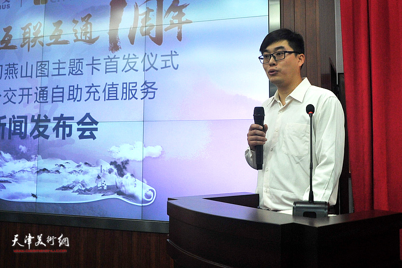在发布会现场,市公交集团相关负责人使用新型“公交易通自助充值终端”现场演示了为主题卡自助充值的过程,这也是自助充值设备首次与市民见面,据悉这一便民自助充值设备将陆续投放使用。现场举行了《千峰万仞燕山图》的赠画受权仪式。《千峰万仞燕山图》为天津著名山水画家皮志刚先生的作品。皮志刚现为国家一级美术师、天津美术家协会理事、天津美协山水画专业委员会副秘书长、天津民革画院理事、天津市书画艺术研究会会员。皮志刚先生自幼酷爱丹青绘事,蒙始就学,晴耕雨读,师从天津著名山水画家孙克纲、孙其峰、赵树松。他的山水画融孙克纲、赵树松两家之所长,峻山盈饱,水色生韵,笔墨华兹,层层深厚,涵浑大气,灵秀韵致,让人感到了“深山茂林绝凉处,奔流急湍鸣管弦”的深奥,达到了空山鸟语息,人听流水语的艺术效果。