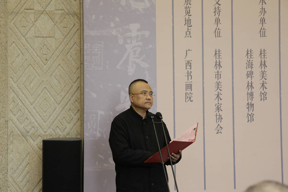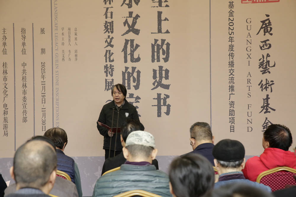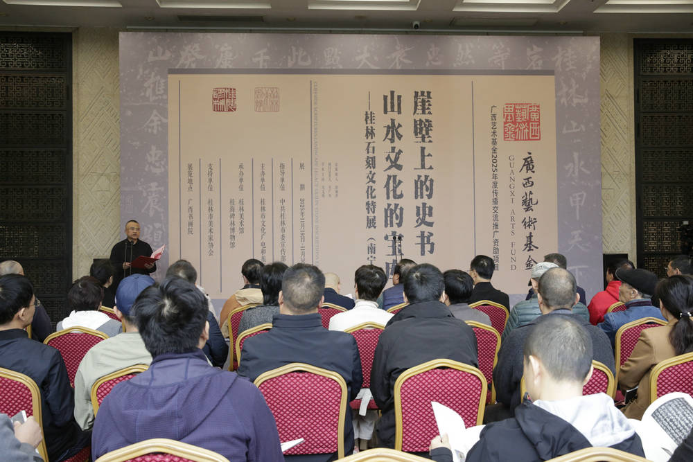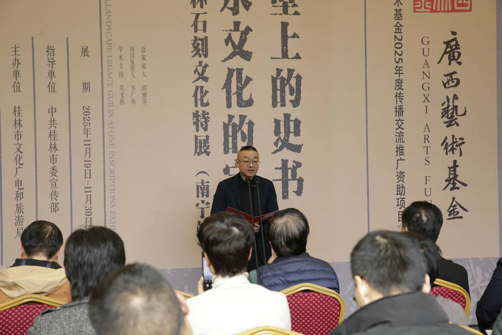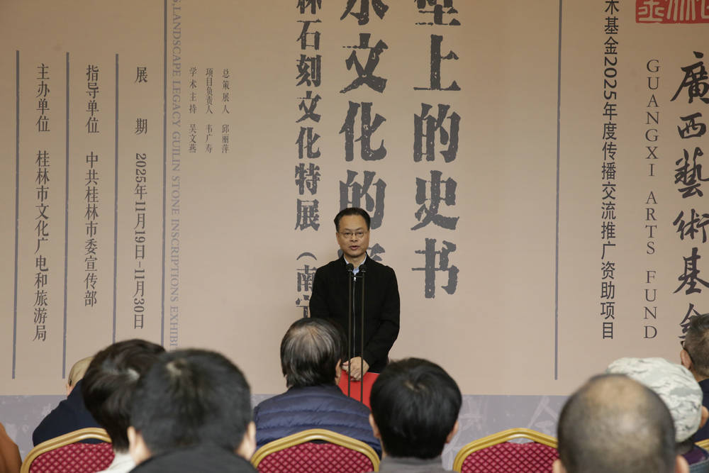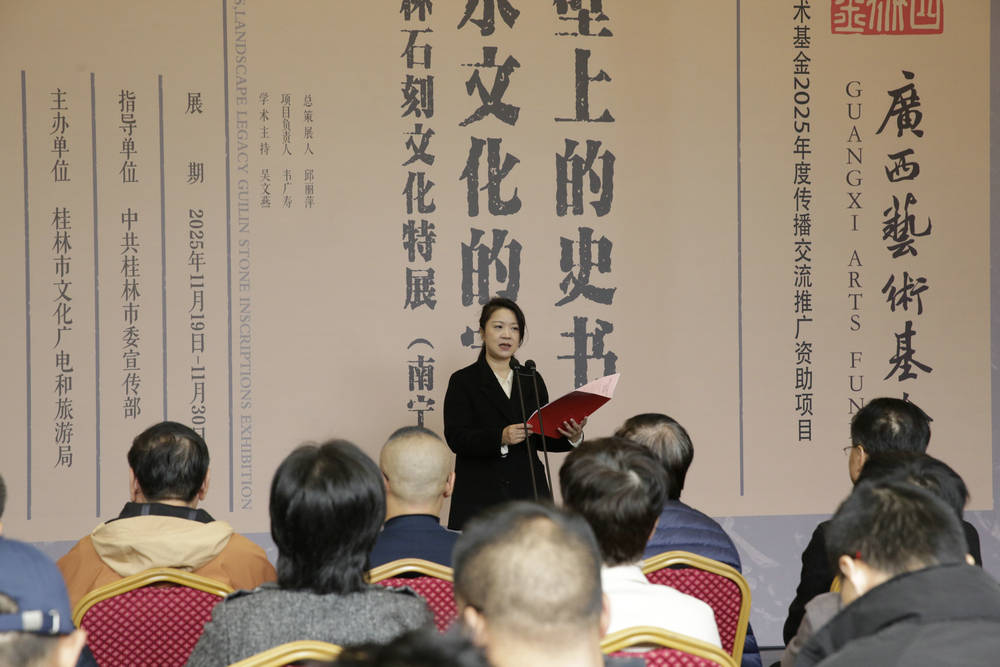 2025年11月19日上午,由广西艺术基金资助,中共桂林市委宣传部指导,桂林市文化广电和旅游局主办,桂林美术馆与桂海碑林博物馆承办的广西艺术基金2025年度传播交流推广资助项目“崖壁上的史书 山水文化的宝库——桂林石刻文化特展”广西巡展第三站在广西书画院开幕。自治区及桂林相关部门领导以及来自区内文化艺术界人士、专家学者、艺术家代表出席了开幕式。