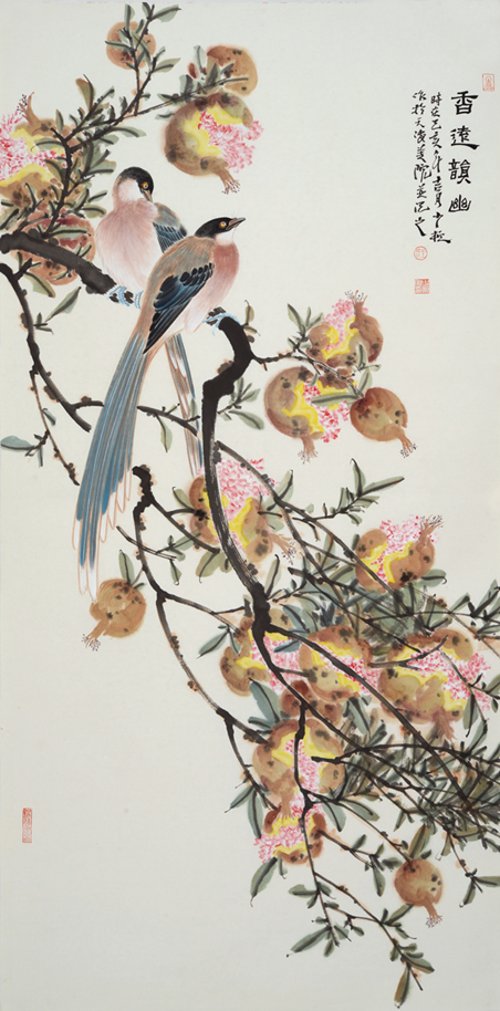 花鸟创作不只是描写或临摹,更多的是融入自己思想,也即是主观的参与性。因此,王少桓巧思构造、运用“移花接木”的手段将美好瞬间呈现在画作中。他喜欢花卉,取材广泛,有传统题材的再创造,也有鸟语花香的新发现;有山花野卉的捕捉,也有田园小景的撷取;有枇杷垂金、石榴结子,有雀的啾唧,鸭的凫游……花有情,鸟有意,在王少桓的心目中,花鸟生命与宇宙自然是融为一体的,致力于作品精神境界的净化和陶冶。